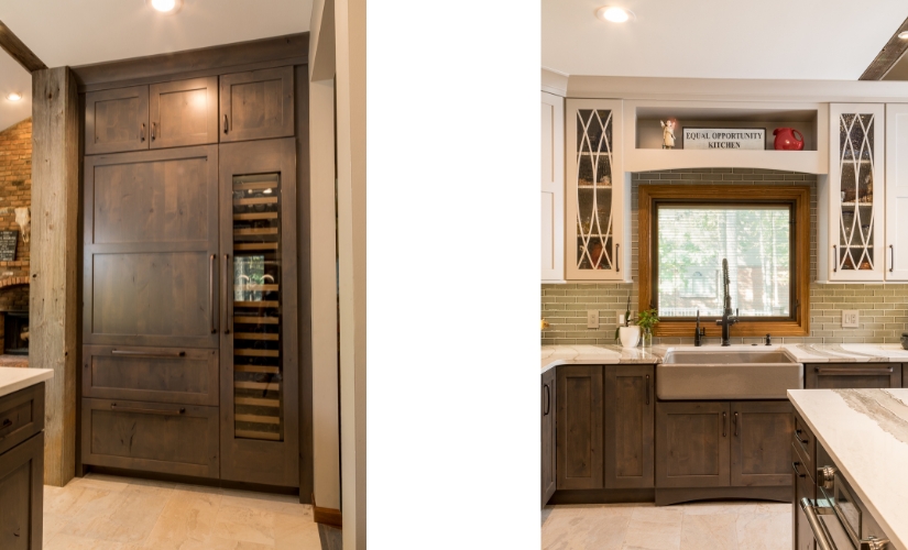 We took space from the hallway closet to establish a butler's pantry, replaced the cabinets, put in all new lighting, tiled the floor, installed oil-rubbed bronze fixtures, and reclaimed some of the room with a slightly smaller island to establish a unique layout that worked better for the family's needs.