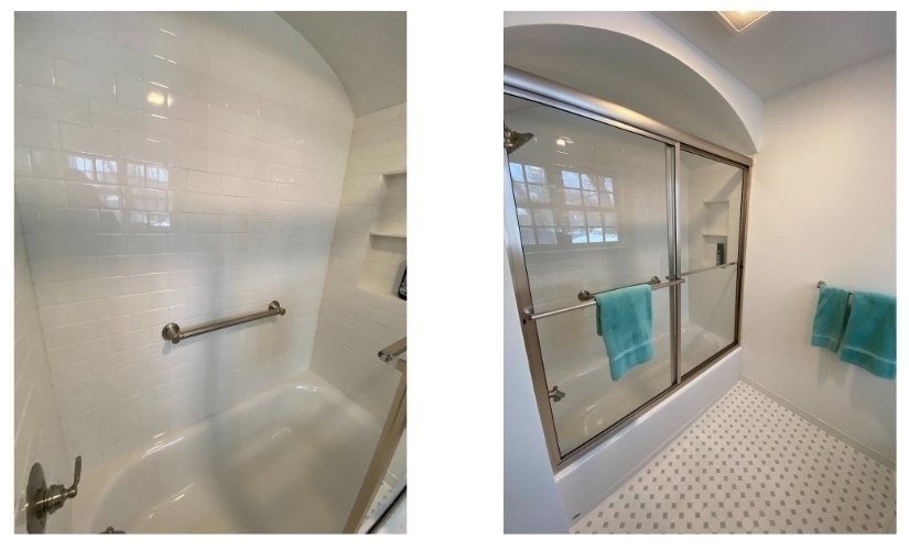 We removed the linen closet which allowed for the sink to be moved down and created more storage and counterspace below the window.