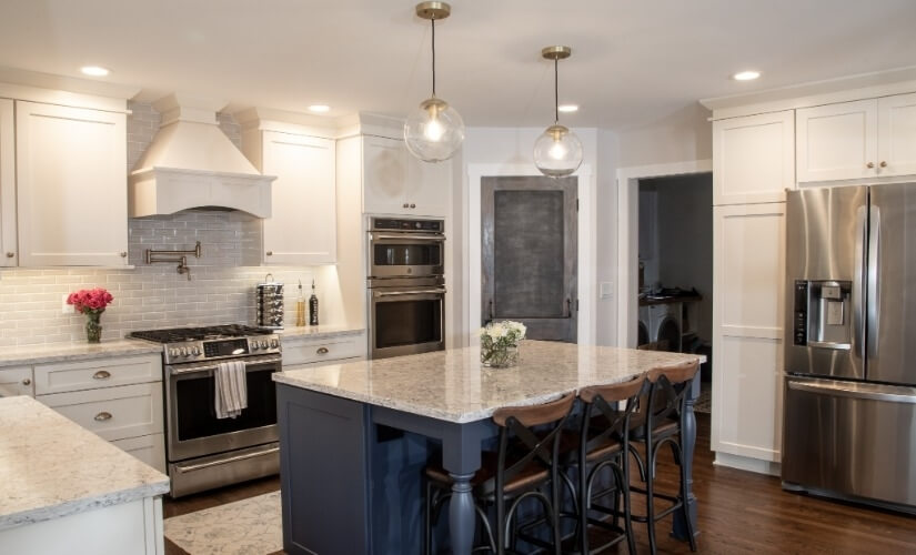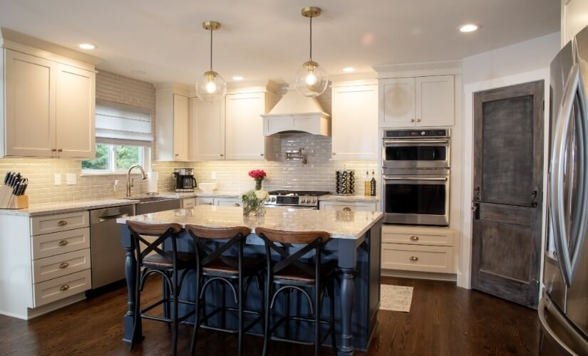Tammy invigorated the space with creamy white cabinetry, a hale navy island, lighting with a wow, and subtle farmhouse details. The open floorplan is now complimented with a built-in dry bar area for entertaining.