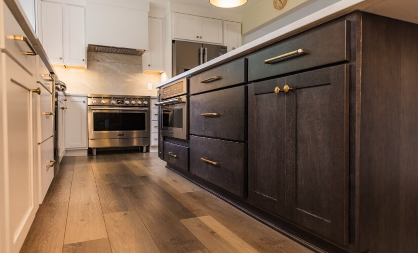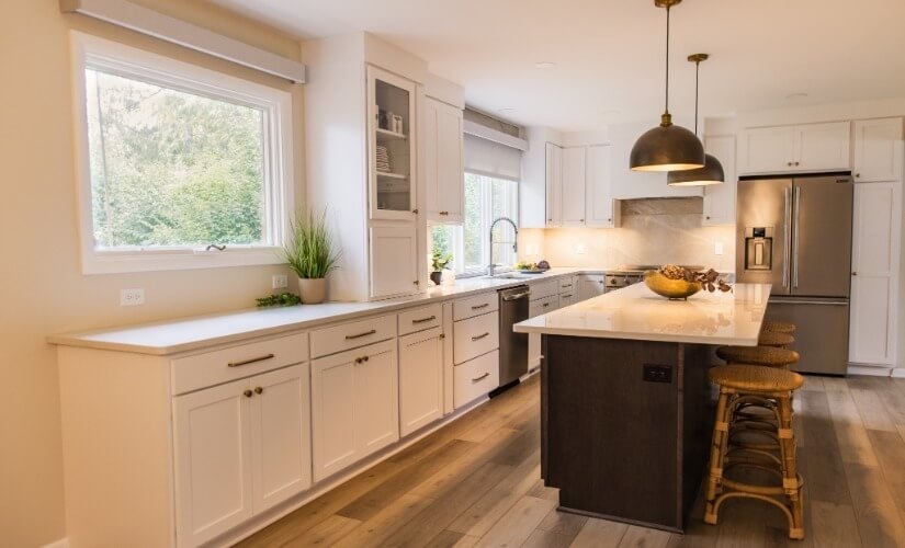 In this inviting white European kitchen, a stained wood island takes center stage, offering a warm and grounding focal point amidst the pristine surroundings. Bold light fixtures dangle gracefully, adding a touch of contemporary flair and drawing attention to the exquisite details of the space. Luxury vinyl wood floors underfoot contribute to a seamless blend of elegance and practicality, infusing the kitchen with a sense of timeless charm. Quartz countertops grace the workspace, providing a durable and luxurious surface for culinary endeavors. The large format tile backsplash adds a touch of modern sophistication, completing the ensemble and creating a harmonious balance of style and functionality in this European culinary haven.
