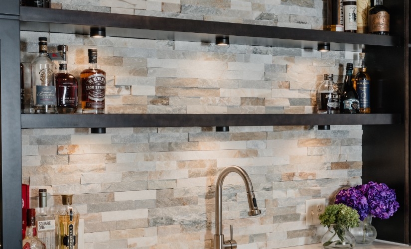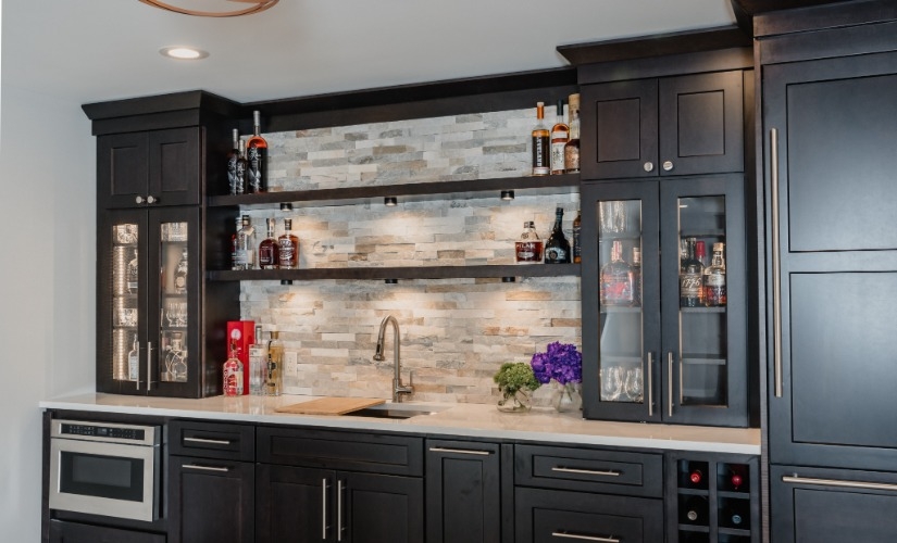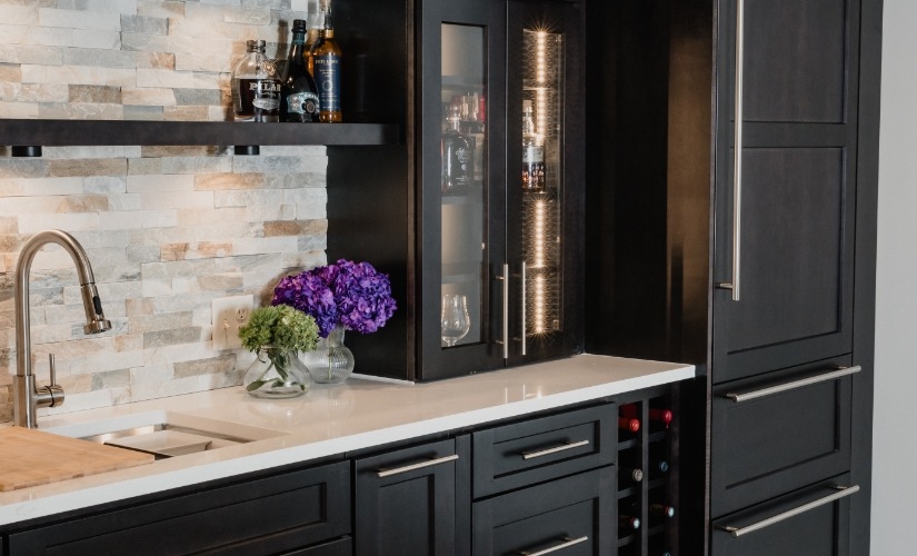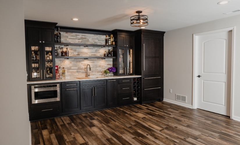 This recent basement project is a perfect example of blending modern style with practical features. The space is anchored by dark cabinets, giving it a sleek and sophisticated look, while the tile backsplash adds a touch of texture and contrast. A built-in fridge is seamlessly incorporated into the design, creating a clean, organized appearance that's both stylish and functional—ideal for entertaining or everyday use. The addition of a workstation sink in the bar area further enhances the room's usability, making it easy to prepare drinks or clean up after gatherings. With thoughtful details like these, this basement is a great example of how DreamMaker transforms spaces into personalized, functional retreats.