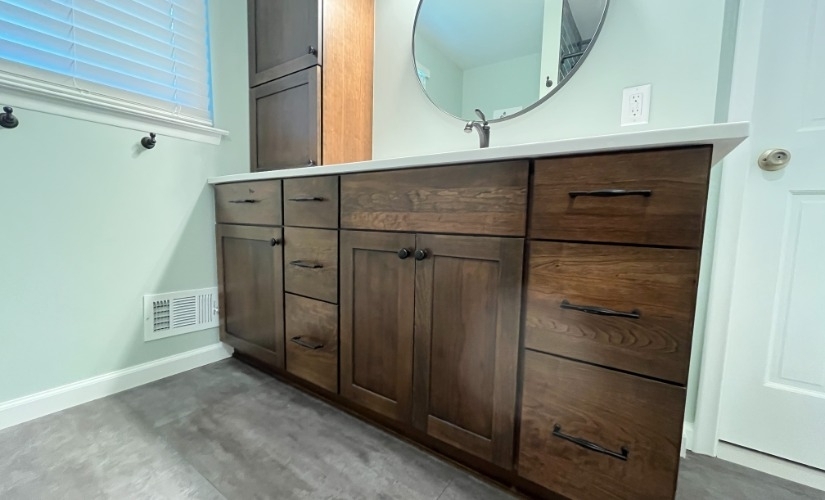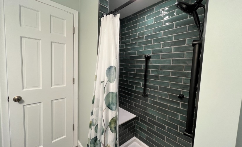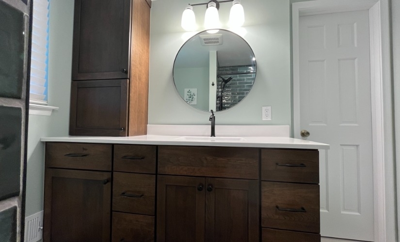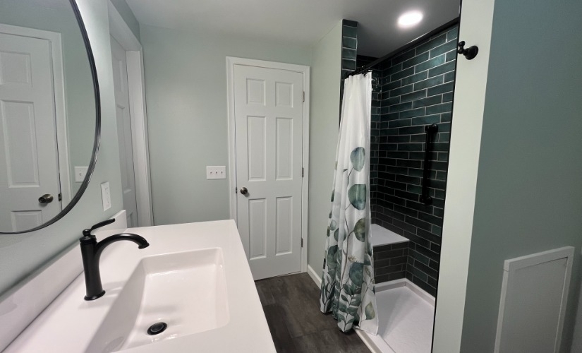 Step into this peaceful bathroom refresh where comfort and style come together. The walls are painted in Sherwin-Williams Sea Salt, a soft, airy green that gives the space a calm, coastal feel. Showplace cabinetry adds warm character and smart storage, with clean lines and a timeless look that blends beautifully with the rest of the design. We used Delta faucets for their smooth function and classic appeal, adding just the right touch of shine. On the floor, Pergo Silver Dust brings a soft, neutral tone that holds up well to everyday life while keeping the space feeling bright and clean. The Onyx countertops provide a rich contrast and a polished finish that anchors the room nicely. One of the standout features is the walk-in shower, finished with 3x12 Daltile Mesmerist tiles. These tiles add movement and depth, with a soft, glassy look that catches the light and adds a little something special. This bathroom now feels open, fresh, and made for everyday relaxation.