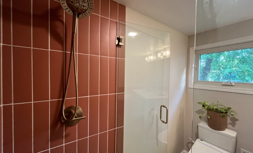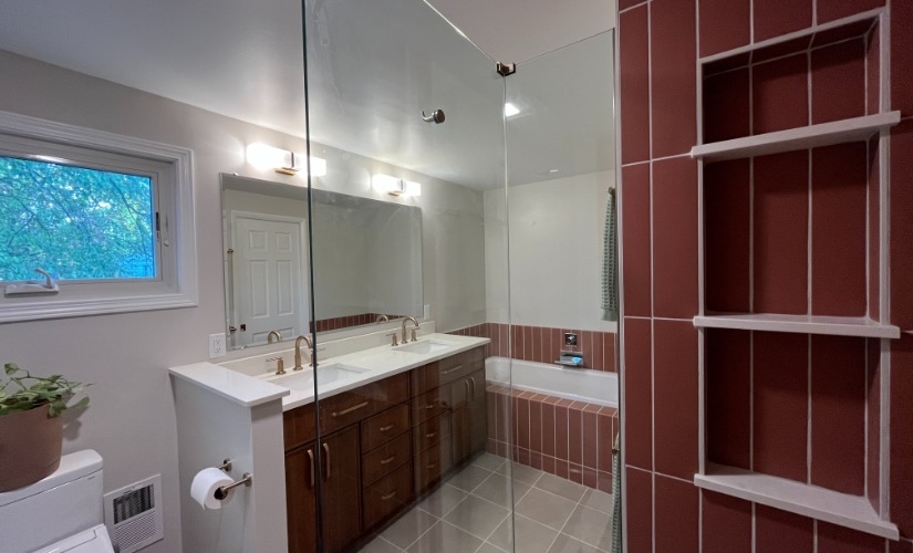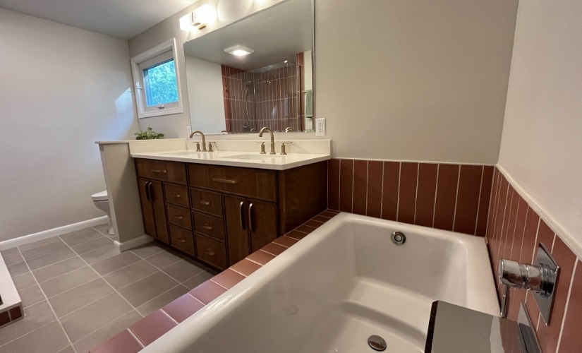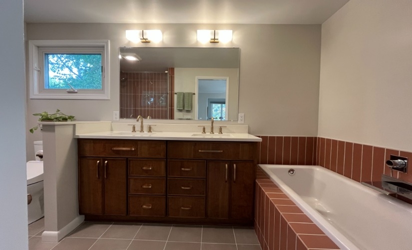 What was once a cramped bath with a pedestal sink and stall shower is now a spacious, spa like retreat. By reworking an awkward hallway and shifting walls and doorways, we gave the clients the functionality they were craving: a generous walk in shower, dual sinks, and a top-of-the-line Toto soaking tub. A new pocket door with a soft close feature maximizes floor space while keeping little fingers safe from slams, a family friendly touch that blends seamlessly into the design. The soaking tub is accented by a striking waterfall style wall mounted filler, adding a touch of drama and luxury to the space. Design wise, this bathroom balances warmth and sophistication. Terracotta tile introduces a calming hint of color and texture, while Delta champagne bronze fixtures bring a refined, modern edge. Rich cherry cabinetry grounds the room with warmth and provides abundant storage, making the space as practical as it is beautiful. From layout to finishes, this remodel transformed an underutilized area into a true luxury oasis tailored for everyday comfort.
